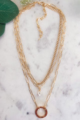This 3 layered necklace features a stunning open circle pendant in shimmering gold. With its delicate design and versatile style, this necklace can elevate any outfit. Perfect for any occasion, it adds a touch of elegance and sophistication to your look.