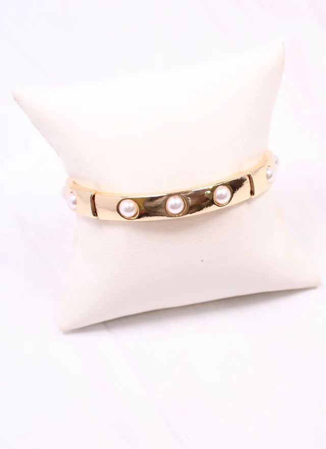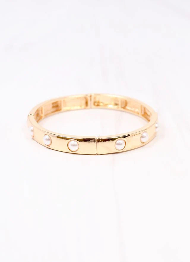 This shiny metal bracelet is accented with pearls for a classic style look. It wear like a bangle but stretches to fit most wrists. Style it by itself or in a stack with other bracelets for a fuller look.