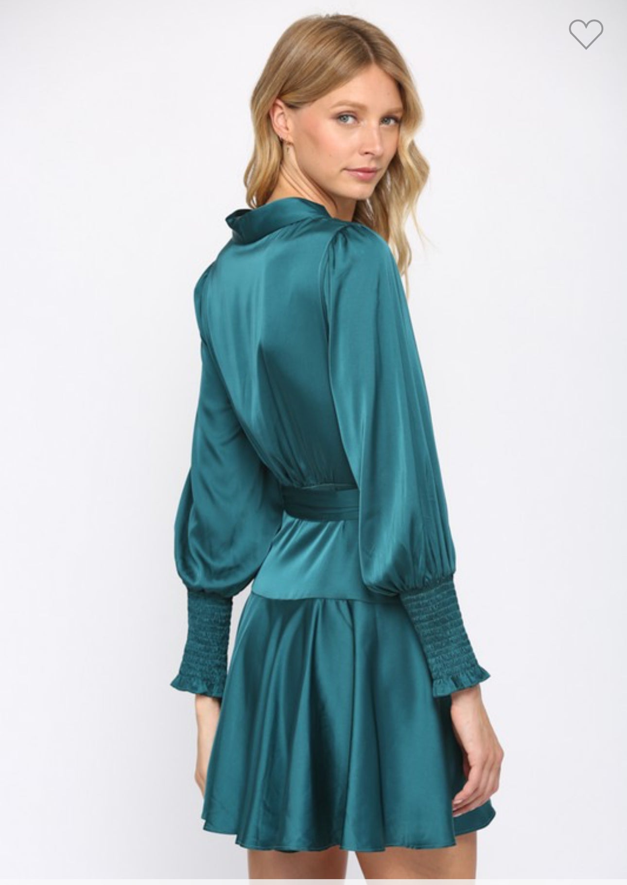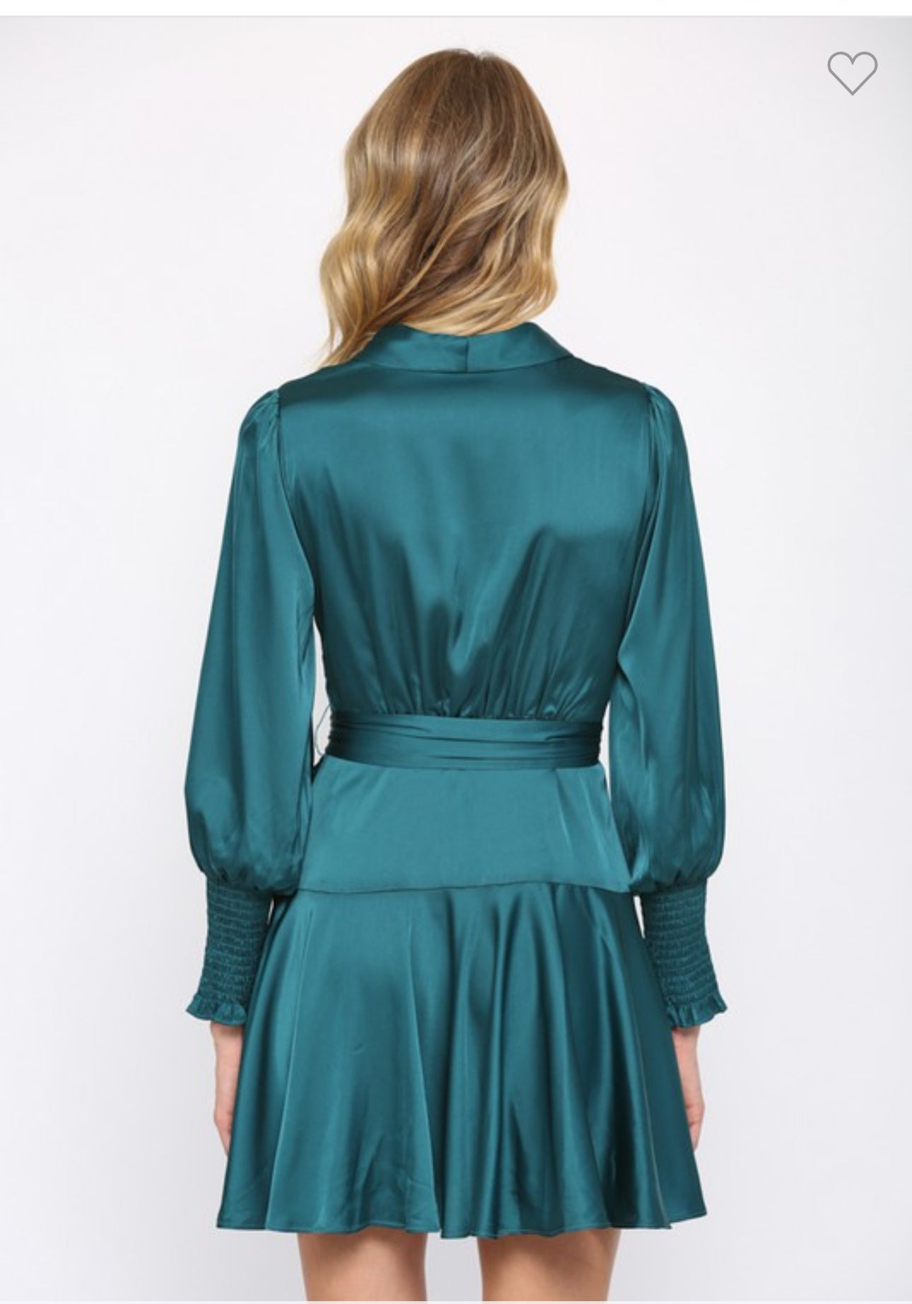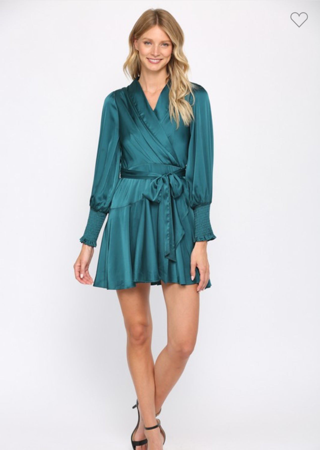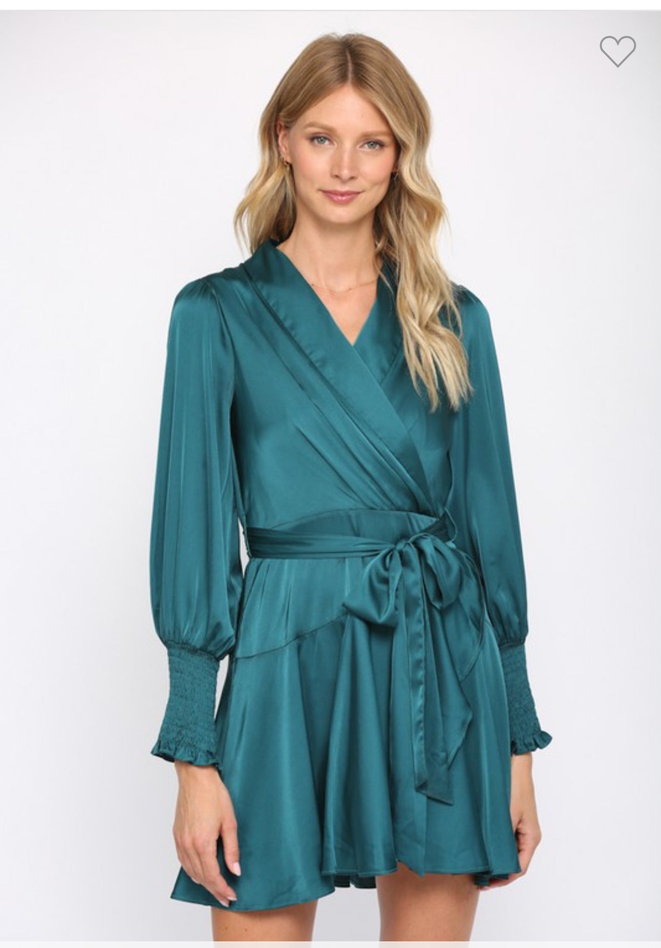 Get ready to turn heads in our Be Sassy Satin Dress! This stunning Teal Green wrap dress features a silky smooth satin fabric and a flattering tie waist design that will accentuate your curves. Perfect for a night out or a special occasion, this dress will make you feel confident and glamorous!