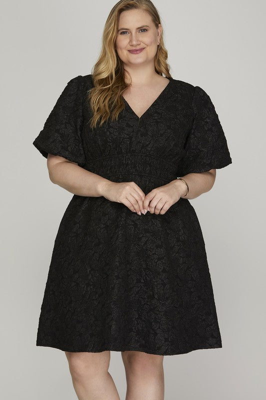 Experience effortless elegance with our Becca Black Balloon Sleeve Jacquard Dress, designed for the curvy woman. Made with a floral jacquard pattern, V neckline, and elasticized waistband for a flattering fit. Its balloon short sleeves add a touch of feminine charm. Lined for your comfort.
