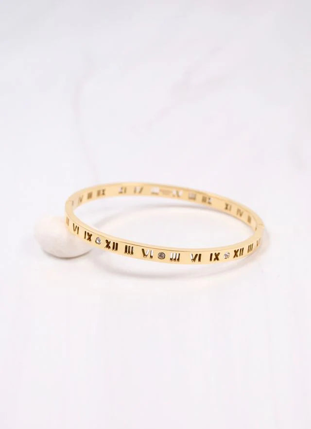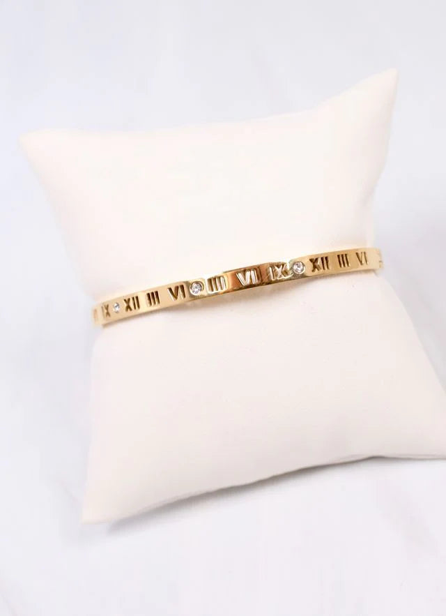 This shiny metal bracelet has a high fashionable look. It features roman numeral cutouts and CZ accents with a side closure. Stainless steel.