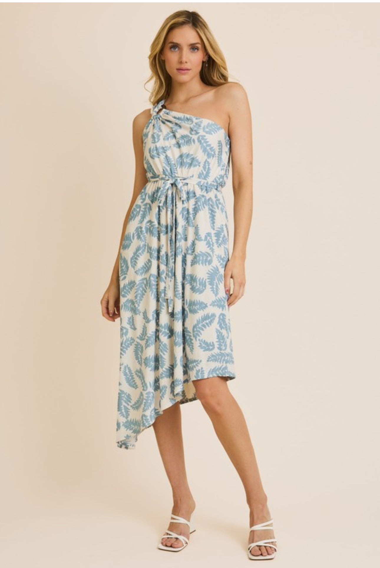 Introducing our Boho Ring Dress, featuring a stylish one shoulder design accented with an o-ring detail. Made with a lightweight and breezy fabric, this dress is perfect for warm summer days. The waist tie allows for a customizable fit, while the leaf print adds a playful touch.