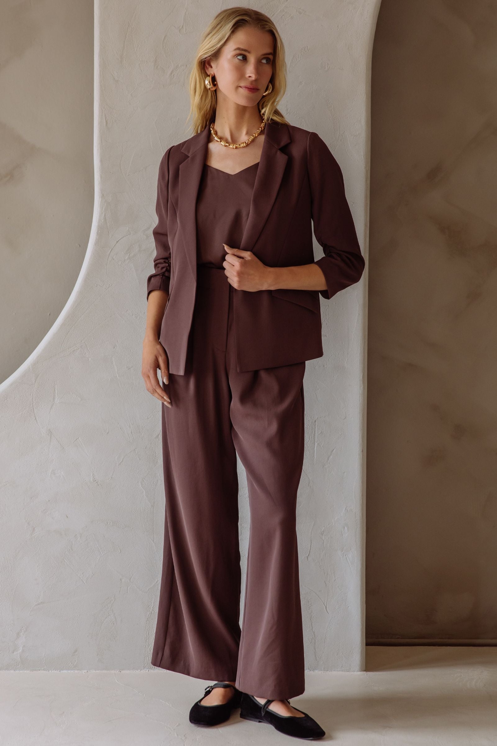 "Be environmentally conscious and stylish with our eco-friendly recycled poly shirred sleeve blazer. Made with 52% recycled poly and 48% poly, this blazer is a sustainable fashion choice. The shirred sleeves add a touch of elegance, and our model looks amazing in a size small. Join the movement and make a statement!"