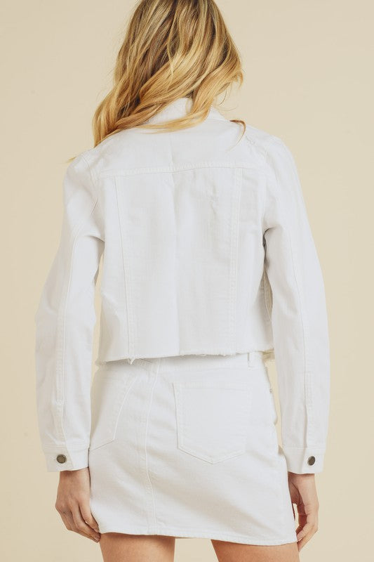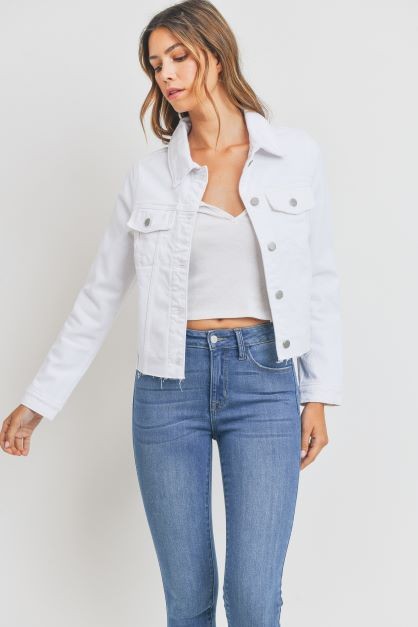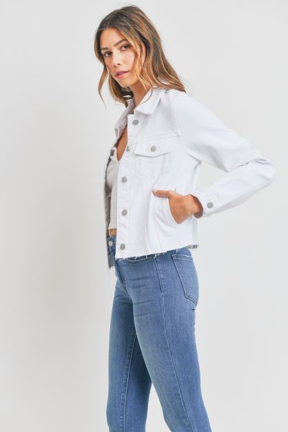 A frayed hem brings an edgier detail to this everyday denim jacket in a bright-white hue.