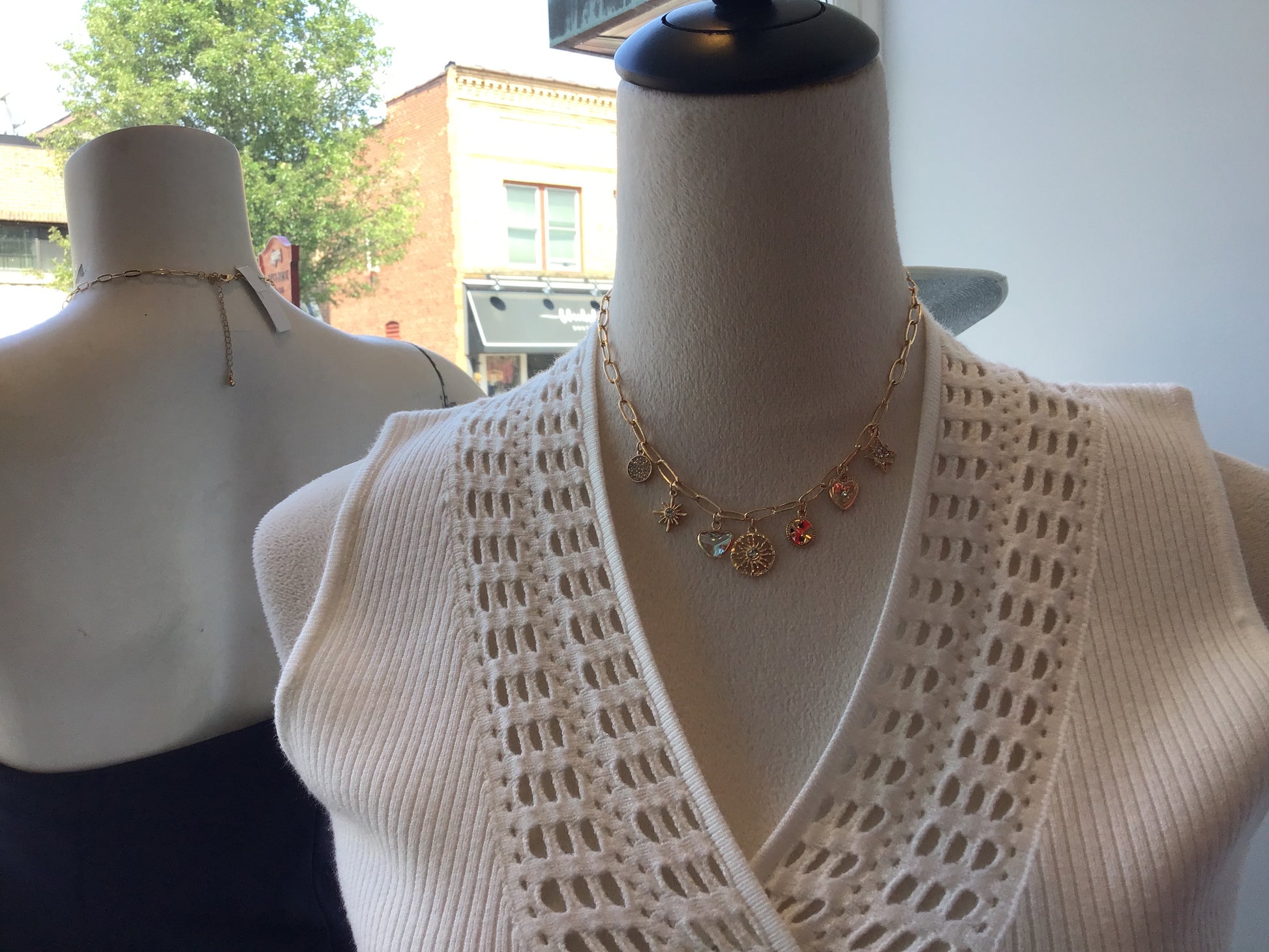 An elegant gold paperclip style necklace adorned with numerous gold charms. Achieve a classic and sophisticated look with this versatile piece. Perfect for adding a touch of glamour to any outfit.