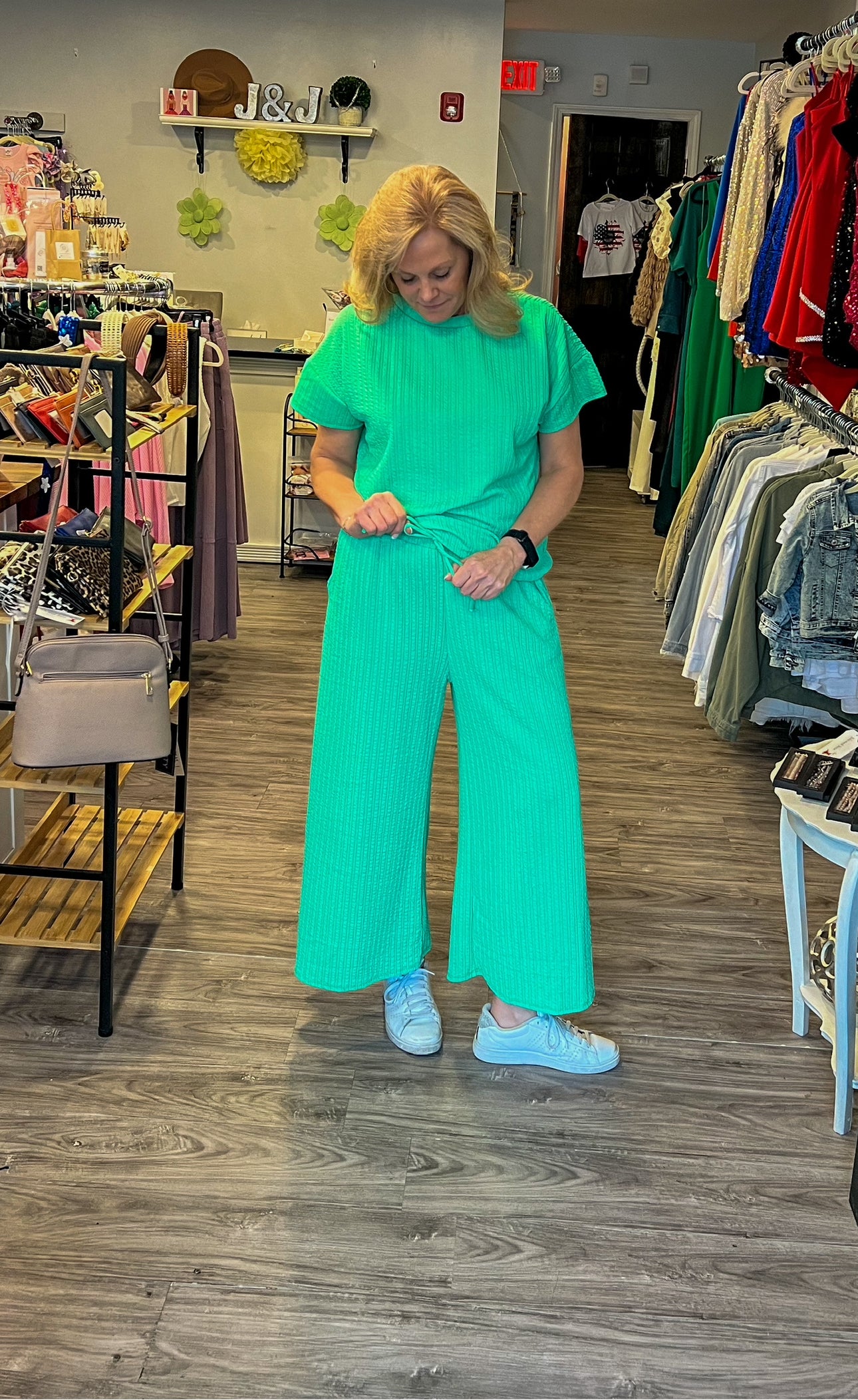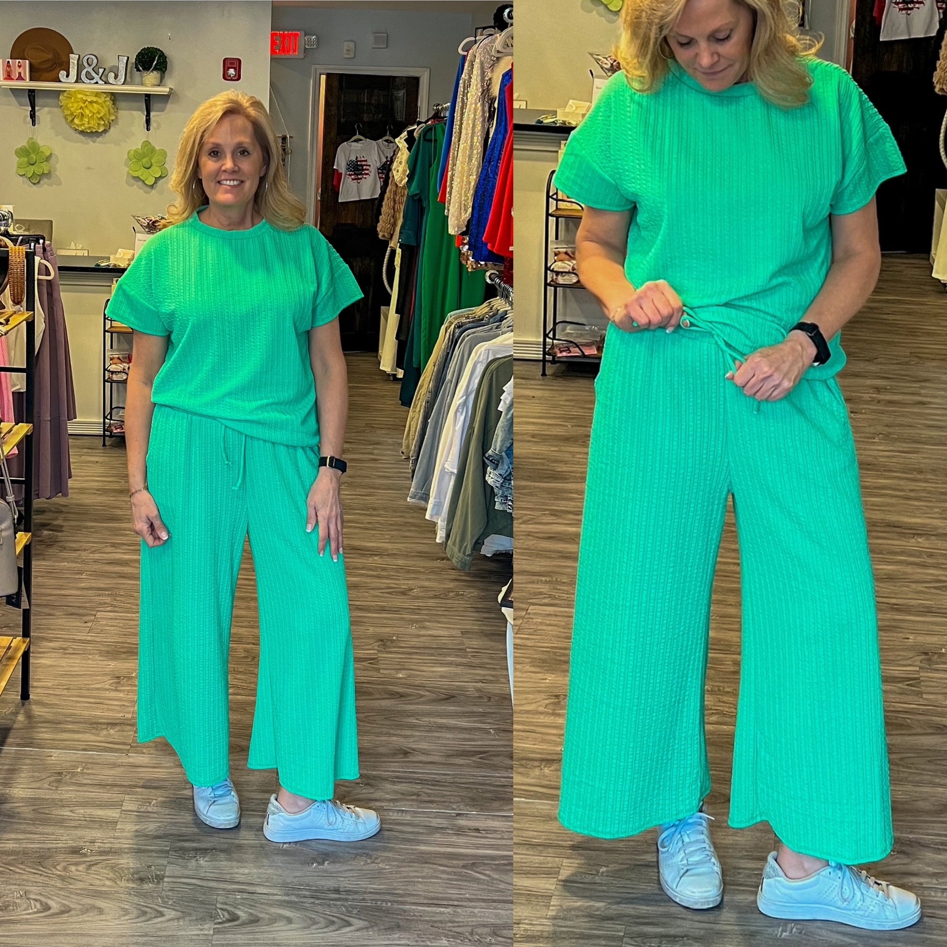 The Garden Party Capri Pants are the perfect addition to your wardrobe! Made from classic twisted yarn knit fabric, these pants feature a wide leg and fitted stretchy high-waisted band for ultimate comfort and style. The 2-tone ribbed fabric adds a touch of vintage-inspired charm. Pair with our textured tops for a complete set. Designed in the U.S.A and made in Mexico. Machine wash cold and cool dry for easy care.