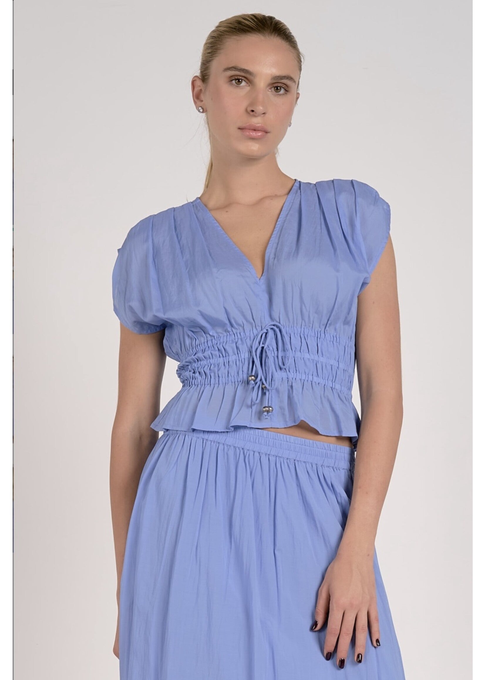The Gigi Top features a ruffled short sleeve design, a cinched waist, and an adjustable waist cinch with strings. Comes in Blue & Ivory