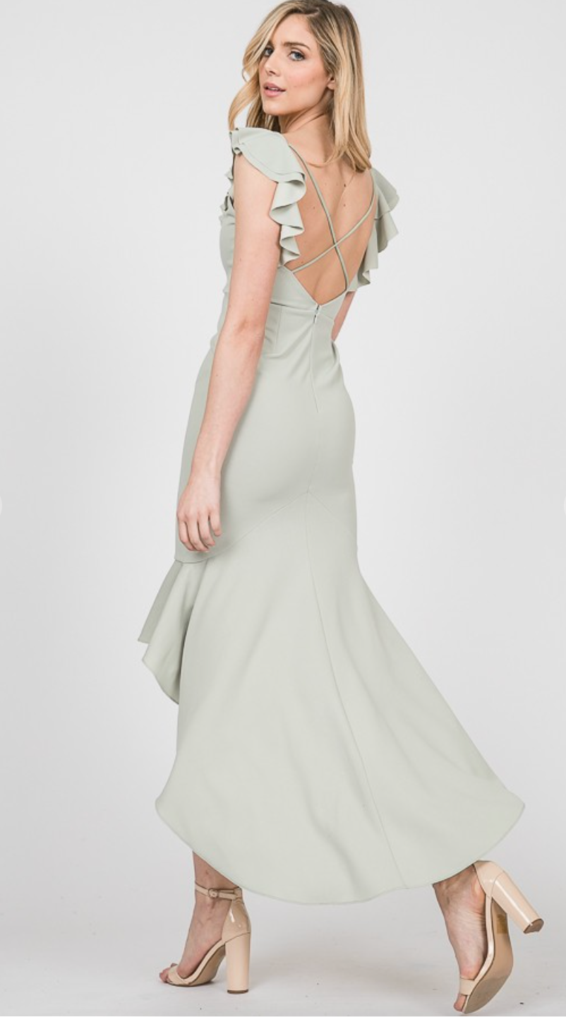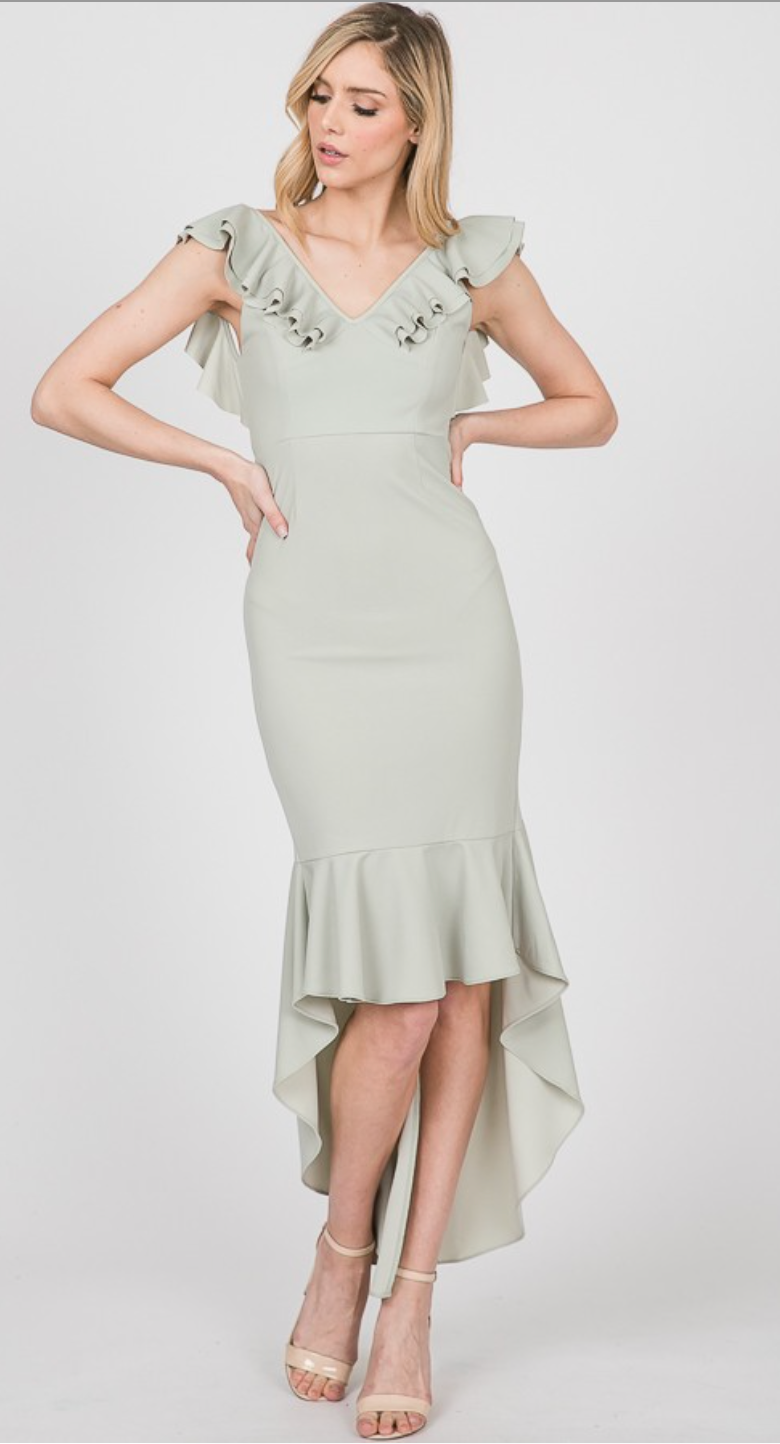 High-Low fishtail back hem midi dress. This dress has non adjustable spaghetti straps and back zipper, partially lined.