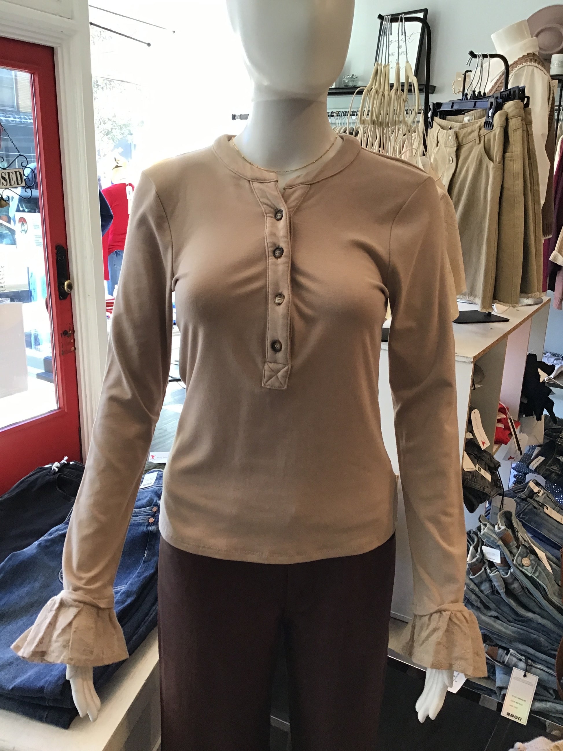 Add a flirty twist to your everyday look with the Lacey Jersey Top. This soft, comfy half-placket tee features playful lace-trimmed cuffs that peek out just enough to catch attention. Perfect for layering or wearing solo, it’s a charming way to keep your casual style effortlessly fun and feminine.