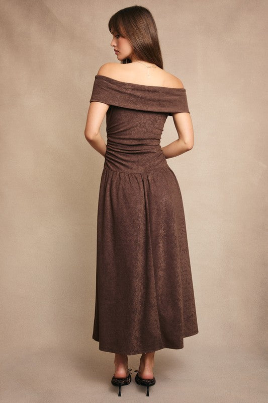Elevate your wardrobe with the Loral Low Waist Dress, crafted from soft knit fabric in a rich brown shade. Featuring an elegant off-shoulder design and a flattering low waist silhouette, this midi-length dress exudes timeless sophistication. Perfect for refined occasions or stylish everyday wear, it effortlessly combines comfort with polished style.