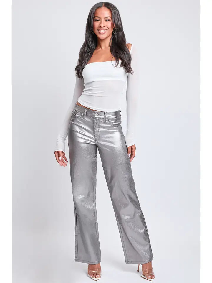 High Rise Straight Leg Metallic Pant by YMI Jeans, where sophistication meets style for the modern woman's wardrobe. Crafted with meticulous attention to detail, these pants redefine casual chic with their sleek design and eye-catching metallic finish. Featuring a high-rise straight leg silhouette, these pants offer a trendy look that effortlessly elongates your legs for a flattering fit. The 1-button closure with zipper ensures a secure and polished finish, while the basic 5-pocket construction adds functional appeal to your ensemble.