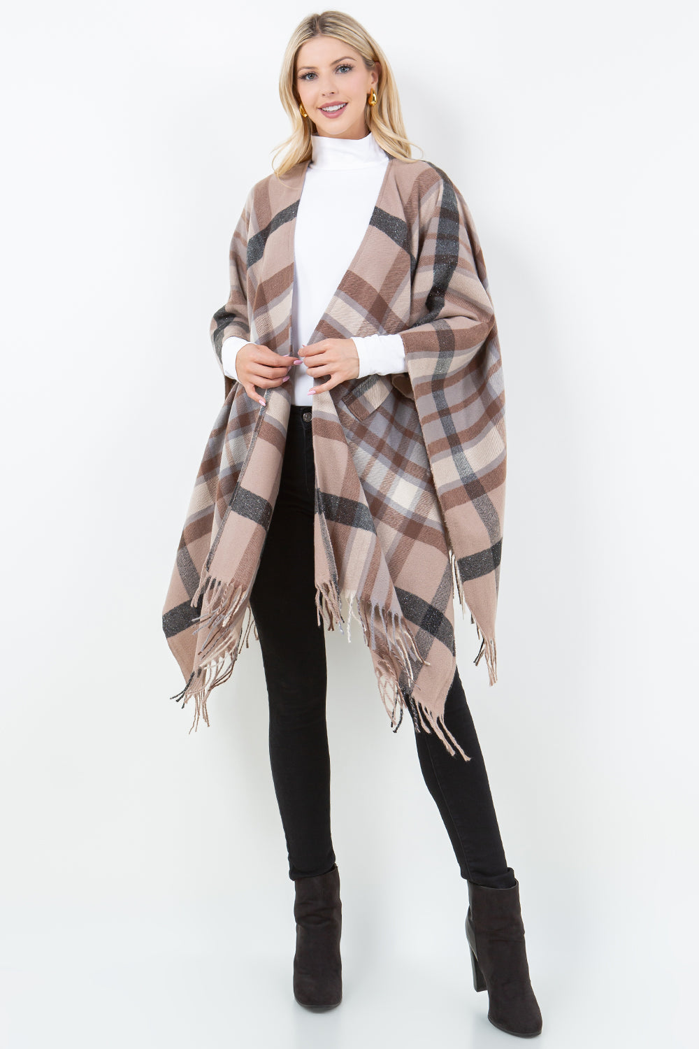 Wrap yourself in shimmer and style with this eye-catching ruana that's equal parts cozy and glamorous. The multi-colored lurex threading catches the light beautifully, creating a dazzling effect with every move. The clever loop-through design keeps everything perfectly in place while you go about your day—no fussing required. Available in classic black or warm tan, this versatile piece layers effortlessly over your favorite outfits and instantly elevates your look from ordinary to absolutely fab