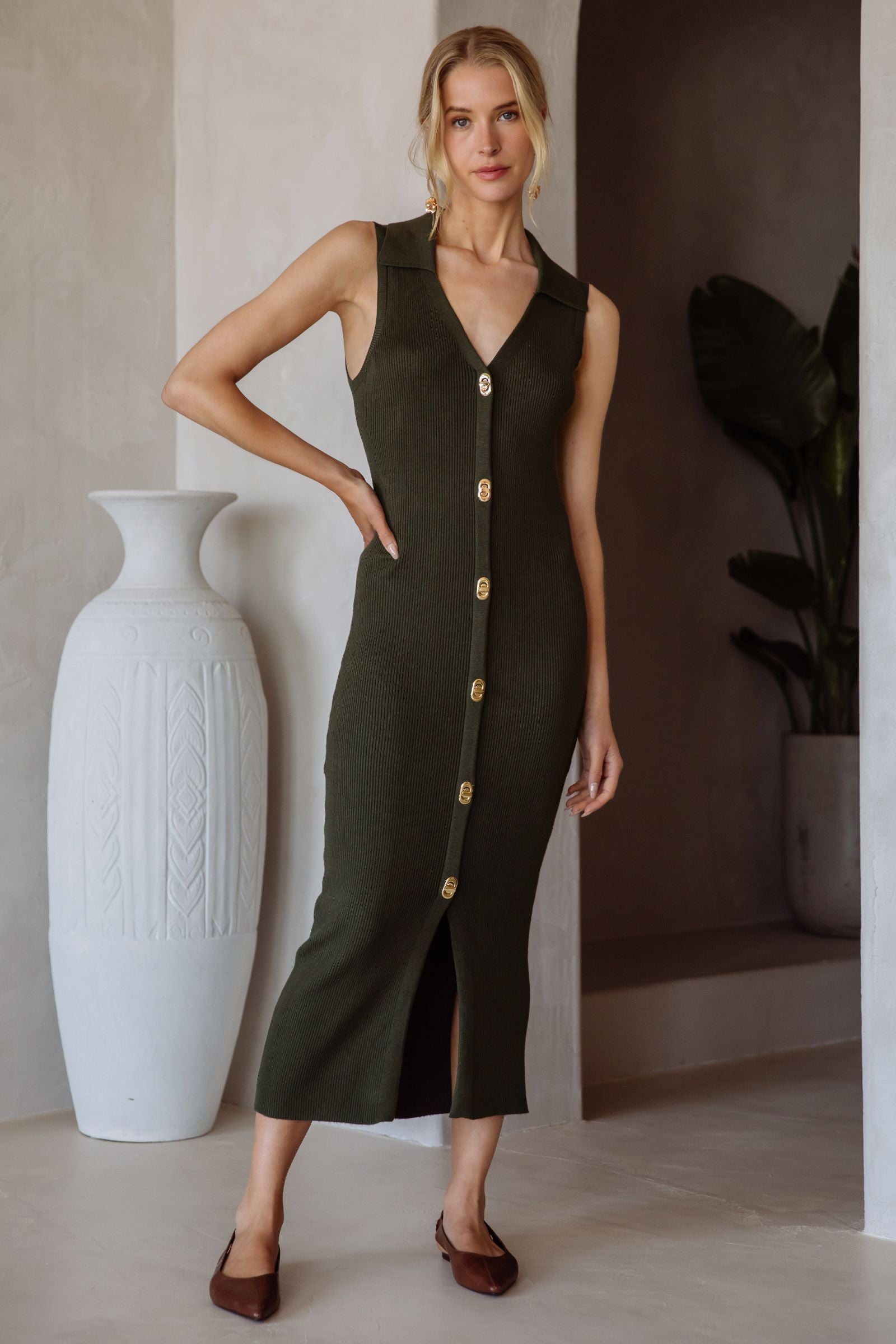 Effortlessly chic, this sleeveless midi dress is the perfect addition to any wardrobe. Featuring gold twist lock buttons, it adds a touch of elegance to the overall look. Perfect for any occasion, this dress will have you looking and feeling your best.