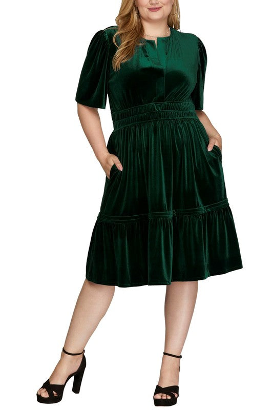 Introducing the Penelope Pintucked Velvet Dress in Curvy, featuring half bell sleeves and a luxurious sea green color. Elevate your style with this elegant and comfortable dress that flatters all curves. Perfect for any special occasion, this dress will make you feel confident and beautiful.