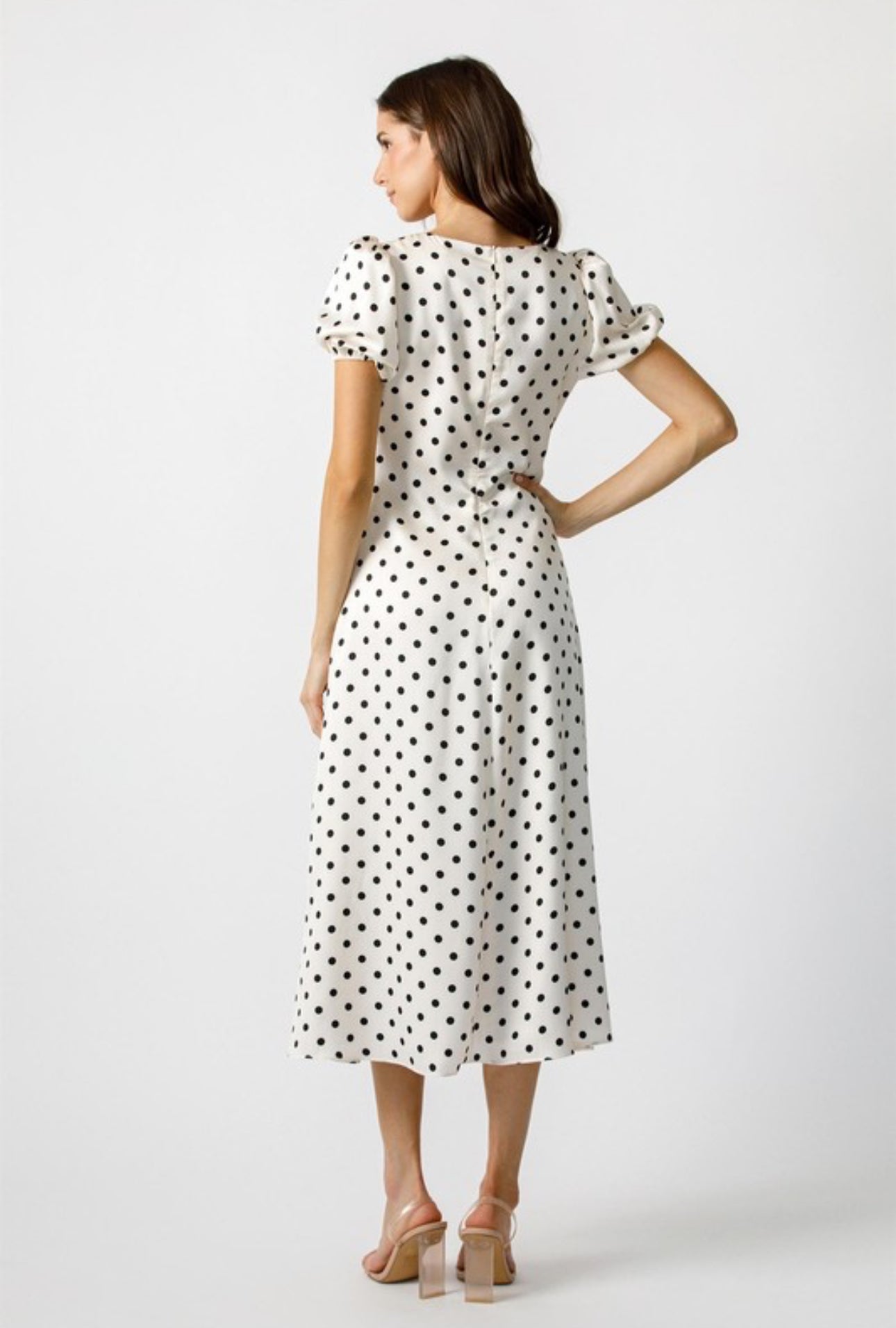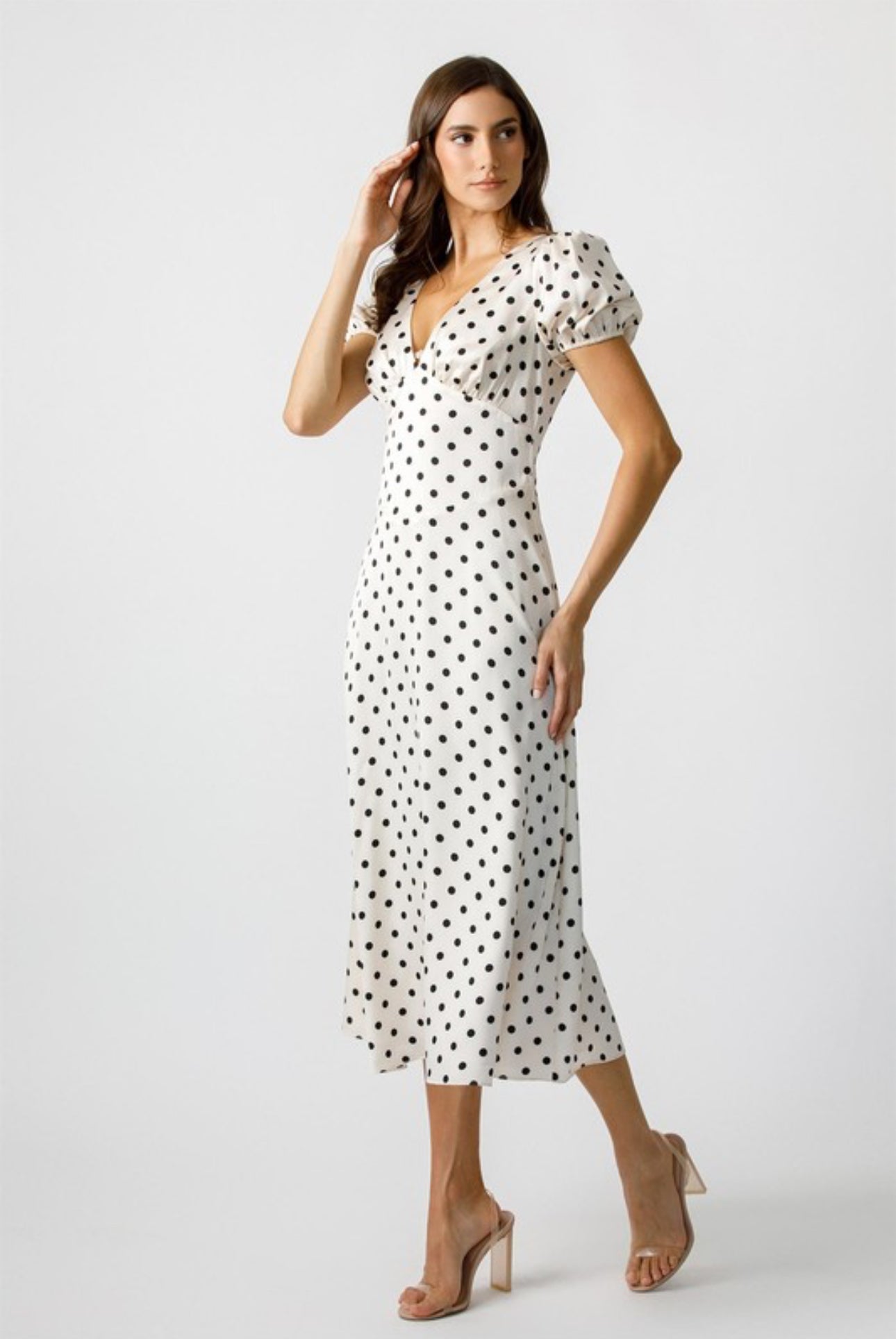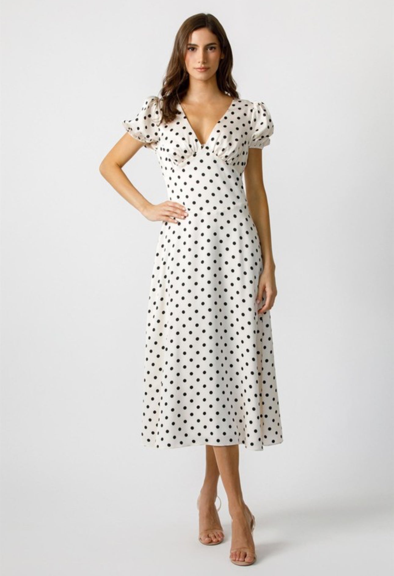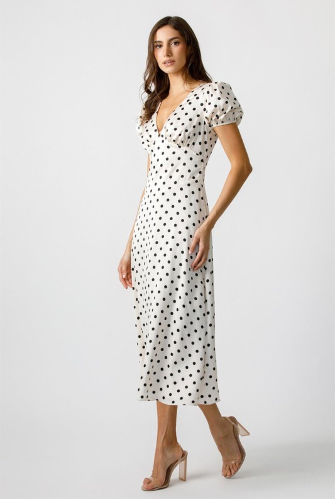 Embrace timeless charm with our Poke My Heart Dress. This mini dress features a classic polka dot pattern, a flattering V neckline, and short puff sleeves. The fitted bodice and A-line skirt accentuate your figure for a sophisticated look. Perfect for any occasion, this dress is a must-have in your wardrobe.