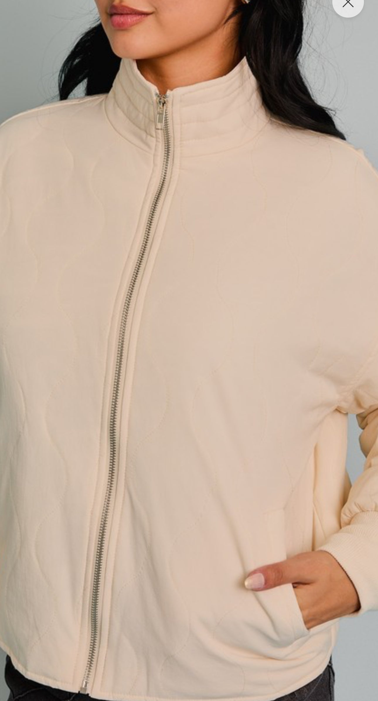 Get cozy in this oversized, cream-colored quilted jacket (great for snuggles and stylish warmth)