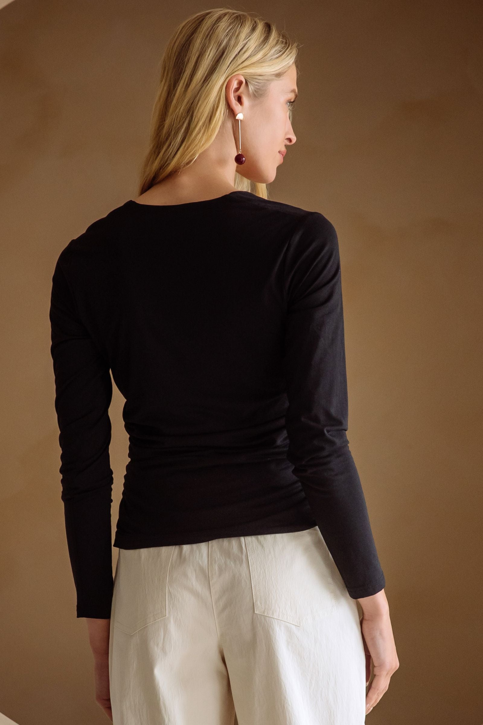 "Stay stylishly ahead of the game in our Regina Rushed Long Sleeve Top. With a flattering square neck and unique side rushed detailing, this top is perfect for any fashion-forward individual. Stay on trend and comfortable in this must-have top!"