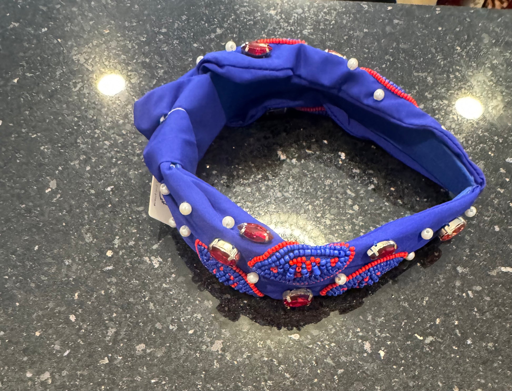 Experience the perfect blend of style and sport with our Seed Bead Football Headband. Made with vibrant blue and red seed beads, this headband is the perfect accessory for any football fan. Stay comfortable and fashionable while showing your team spirit.