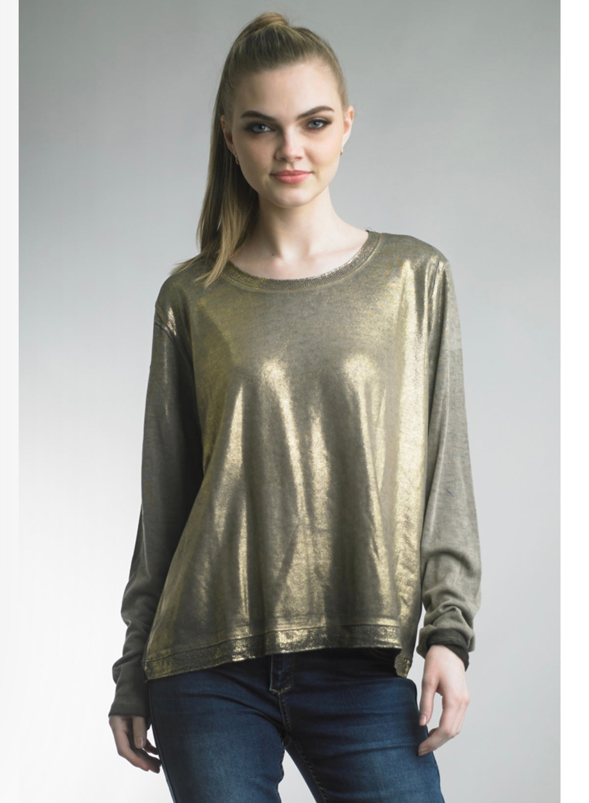 "Spice up your wardrobe with our Shine Gold Tee! This long sleeve tee is sprayed with a touch of gold, giving it a unique, eye-catching shine. Perfect for adding some glam to your everyday look. (Trust us, you'll be the talk of the town.)"