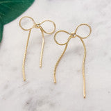 These elegant Snake Chain Bow Earrings have a sophisticated snake-chain design and are made of high-quality gold. Perfect for any formal occasion, these earrings add a touch of glamour to any outfit. The unique bow shape and shimmering gold finish make these earrings a must-have in any jewelry collection.
