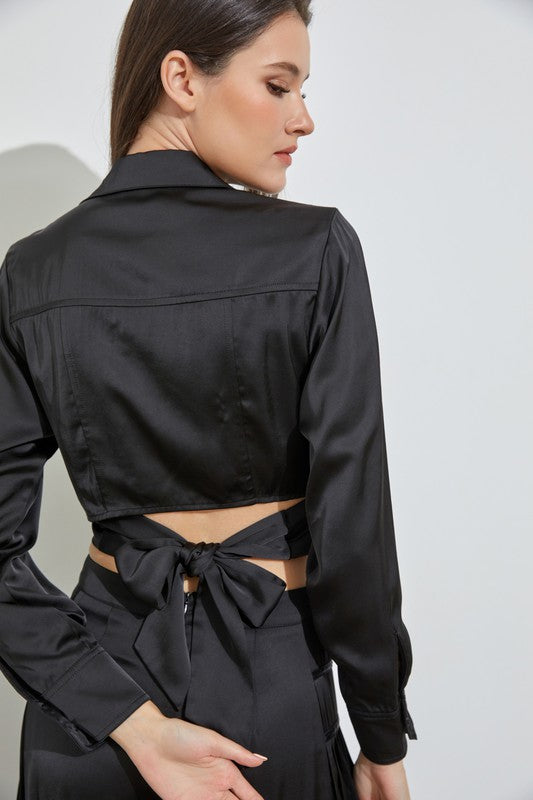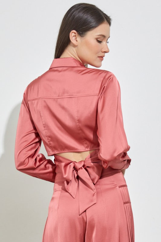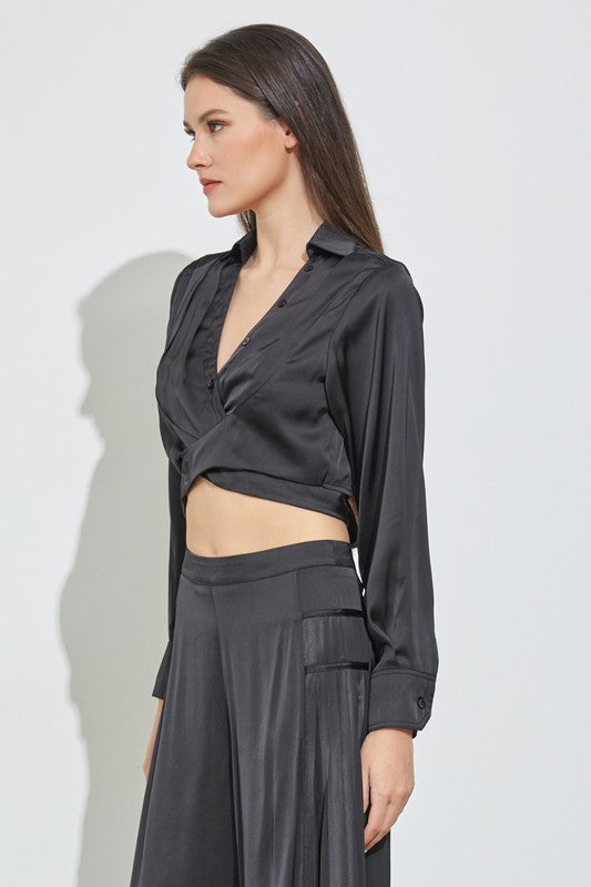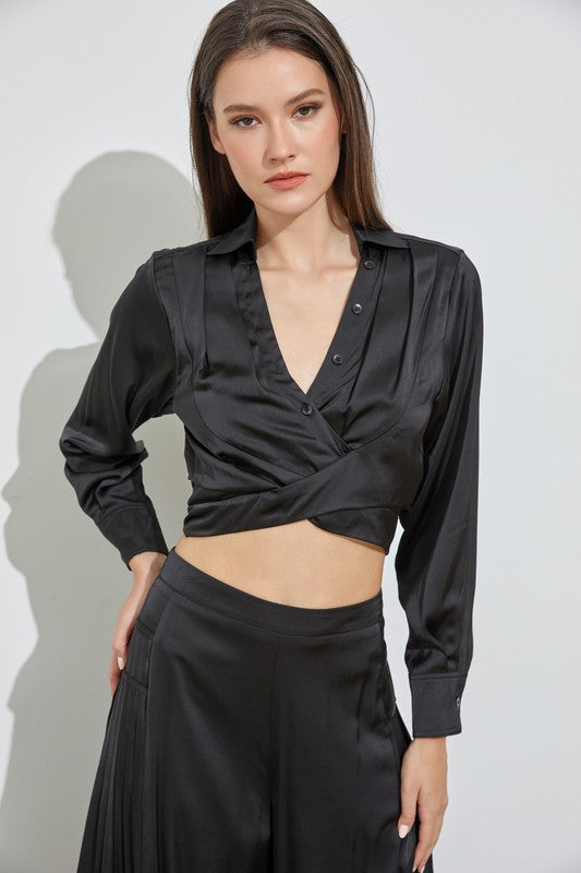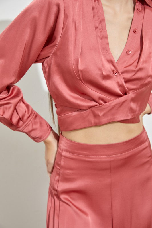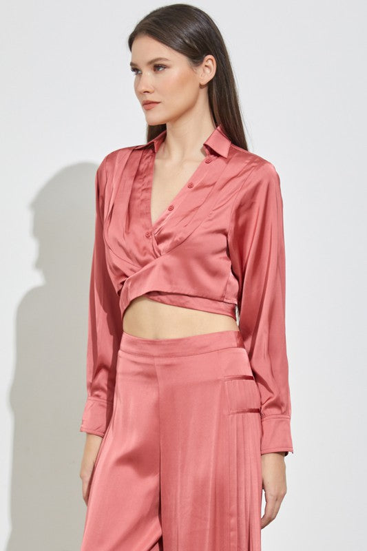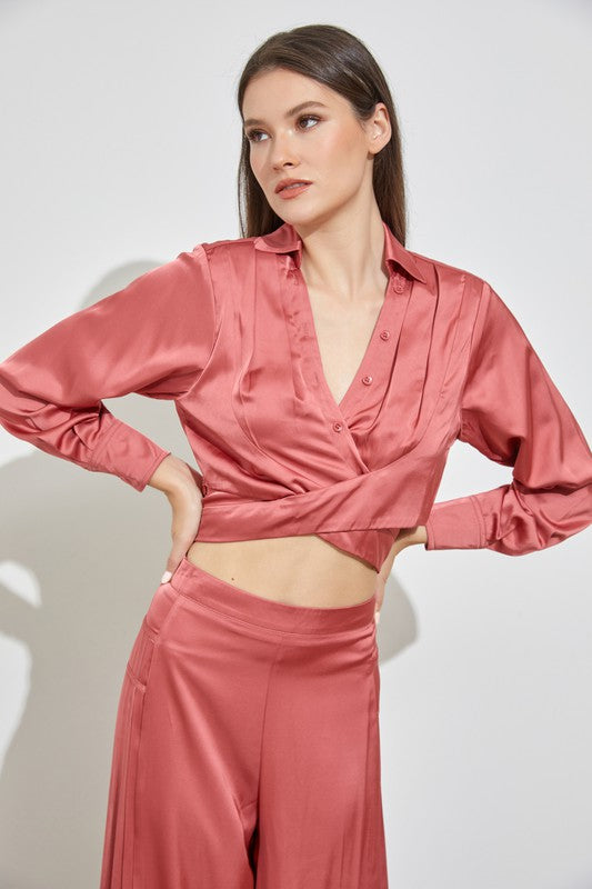 The Wella Wrap Collar Top will take you from special occasions to casual outings in style. Made from luxurious satin, this top features a flattering wrap design with an effortless tie closure – perfect for adding a touch of elegance to any wardrobe. Stand out in Burnt Rose or Black!