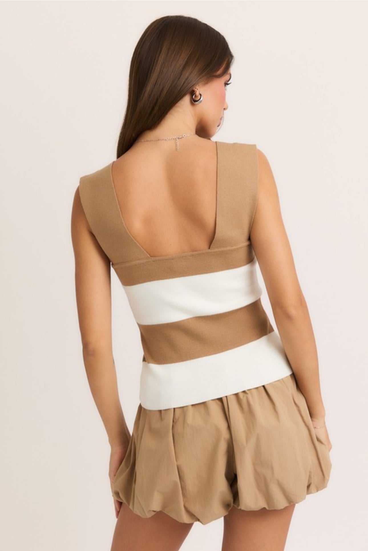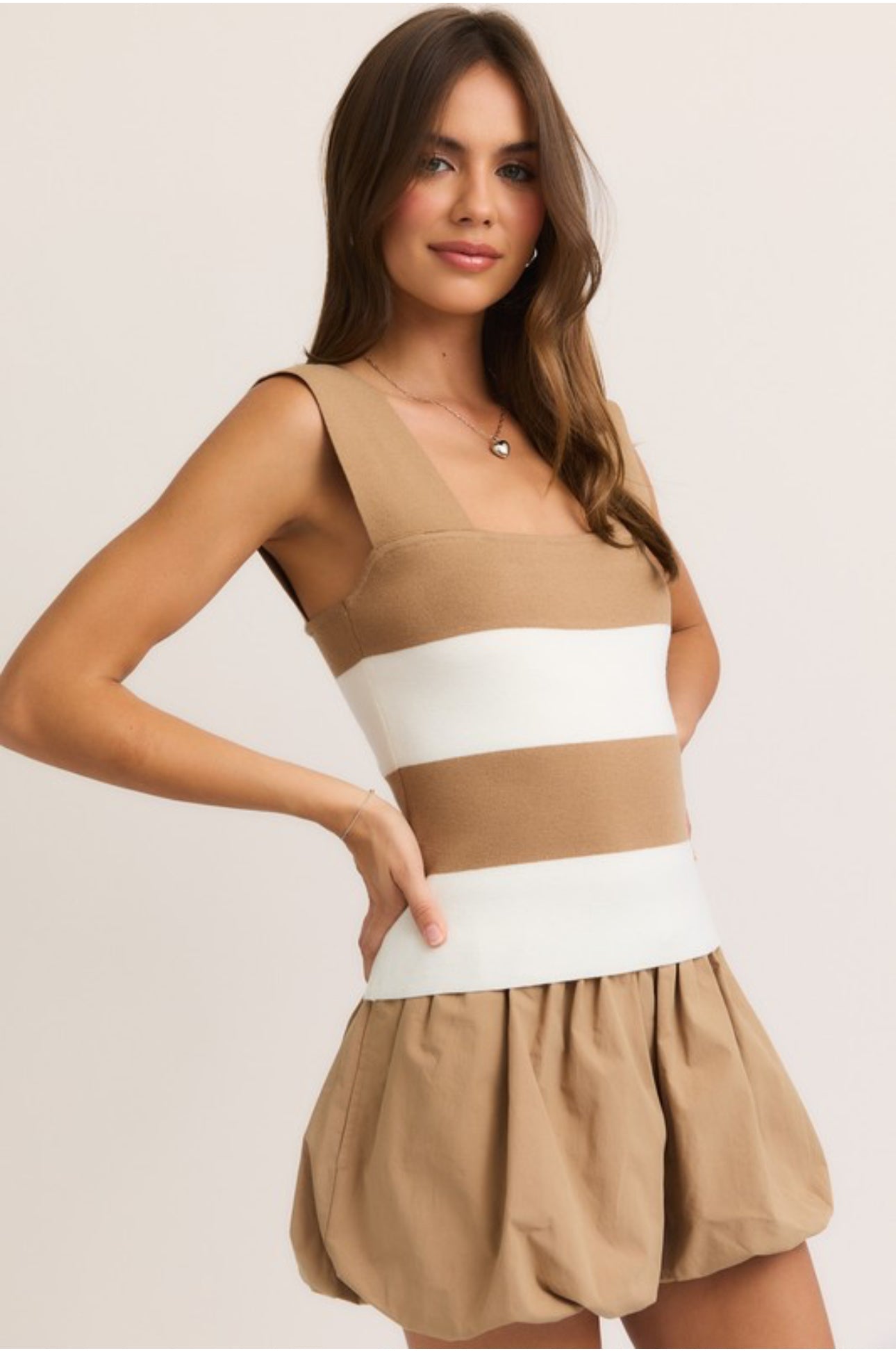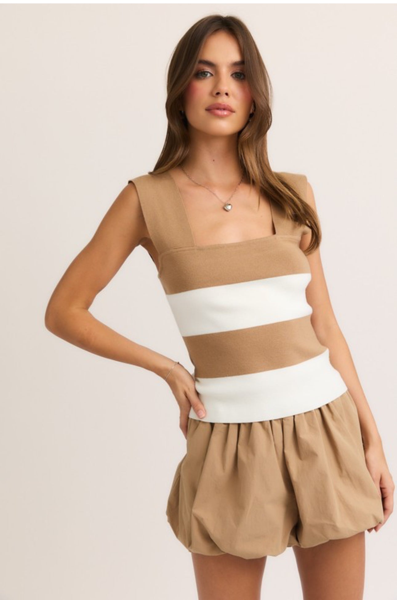 Get ready to rock and roll with the Wilma Wide Strap Top in a trendy beige and white stripe! Perfect for adding some serious style to any outfit, this sweater top will become a staple in your wardrobe. Catch eyes and turn heads with Wilma!