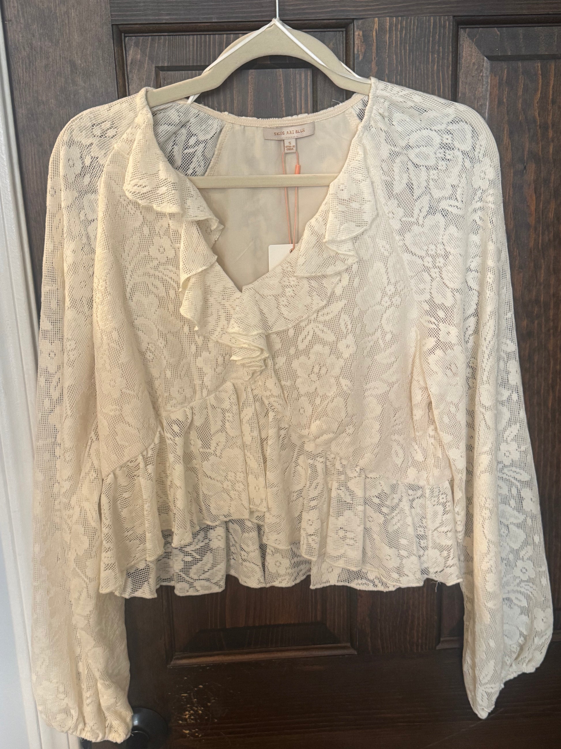 The You Got Me Ruffled Top is an elegant and versatile addition to any wardrobe. With delicate ruffle lace detailing and long sleeves, this top effortlessly combines femininity and comfort. Available in ecru, it adds a touch of subtle sophistication to any outfit.