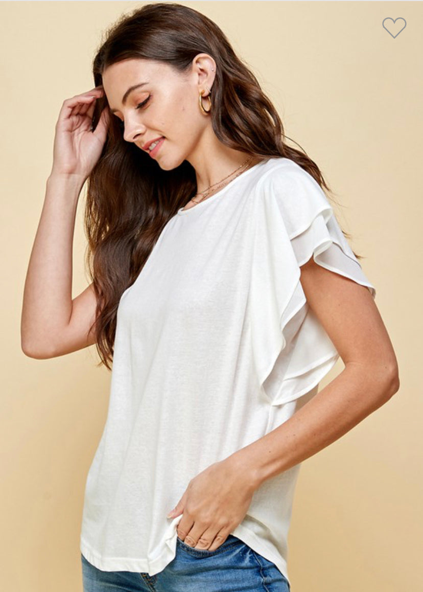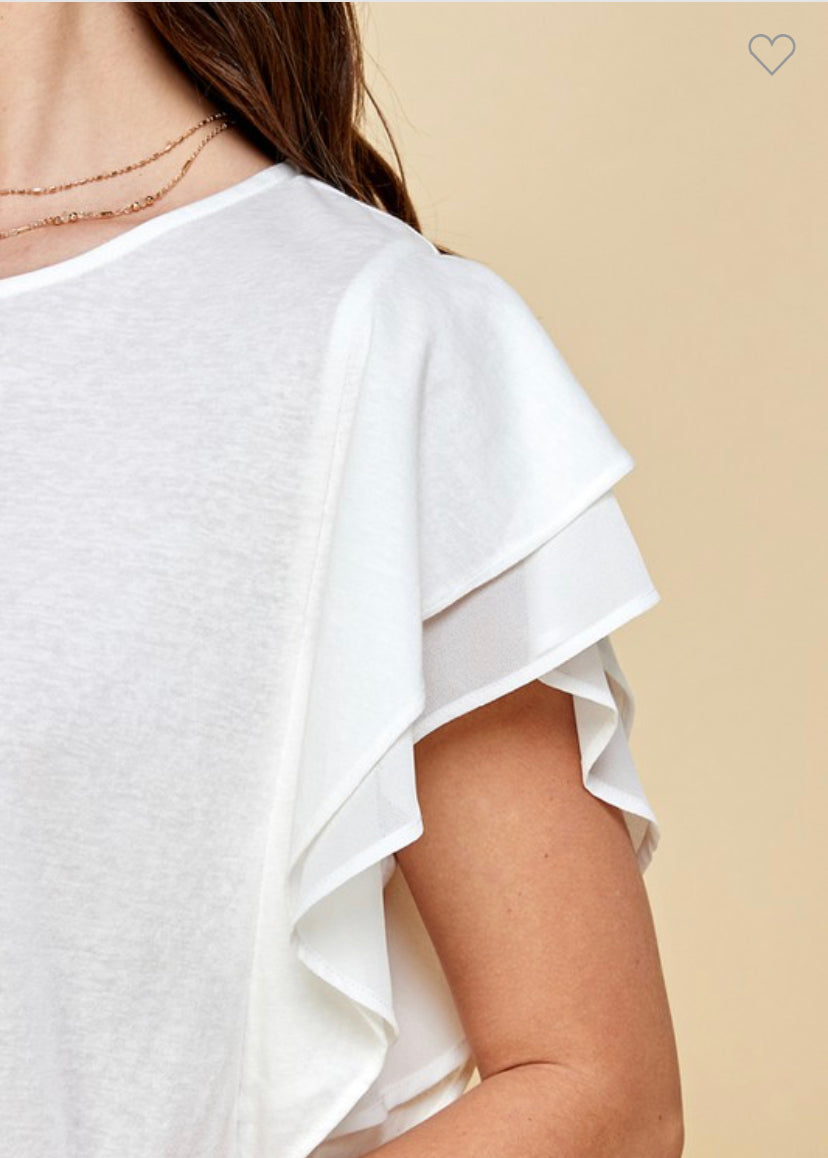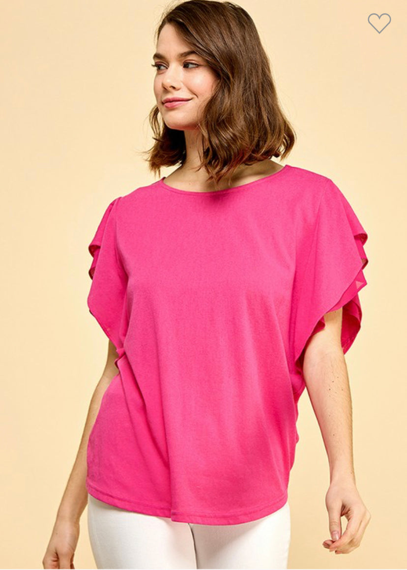 Look how cute this double ruffle short sleeve top is. This solid round neck top is 65% cotton and 35% polyester. It comes in your choice of fuchsia or white dress this beautiful top up or down. It will be a perfect addition to your wardrobe.